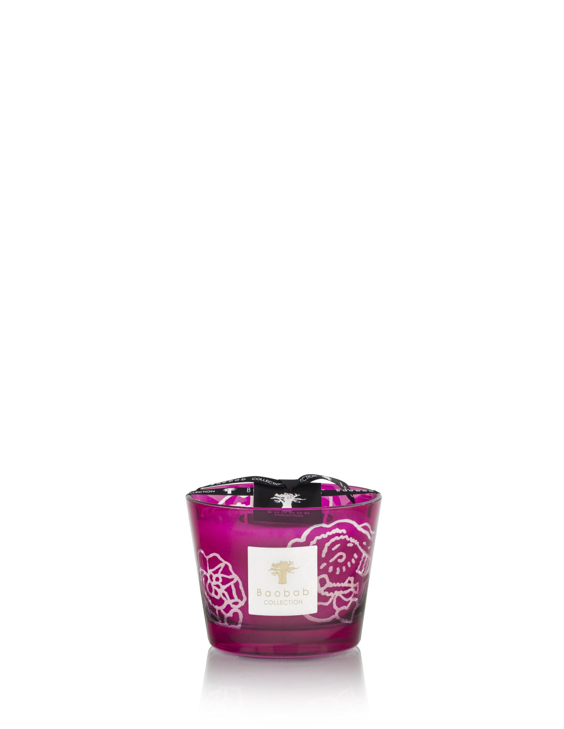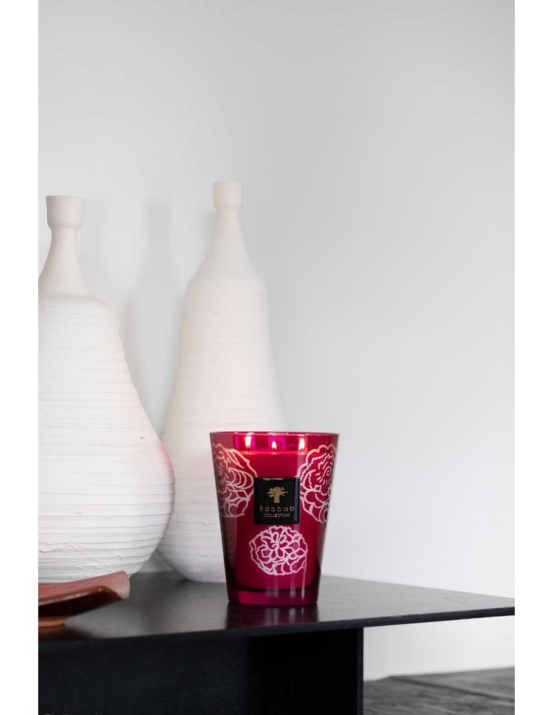 Entre bordeaux et prune, le verre coloré de la bougie parfumée Collectible Roses Burgundy est gravé à la main de roses stylisées comme un imprimé de mode. Cette réalisation fait honneur à la dextérité de nos artisans graveurs qui doivent reproduire le dessin avec justesse.
