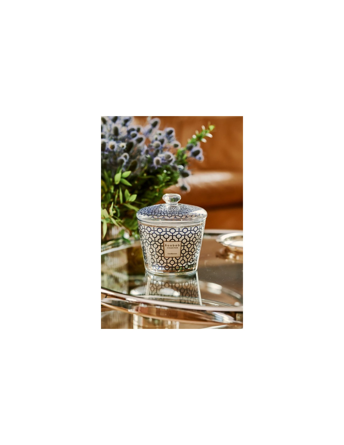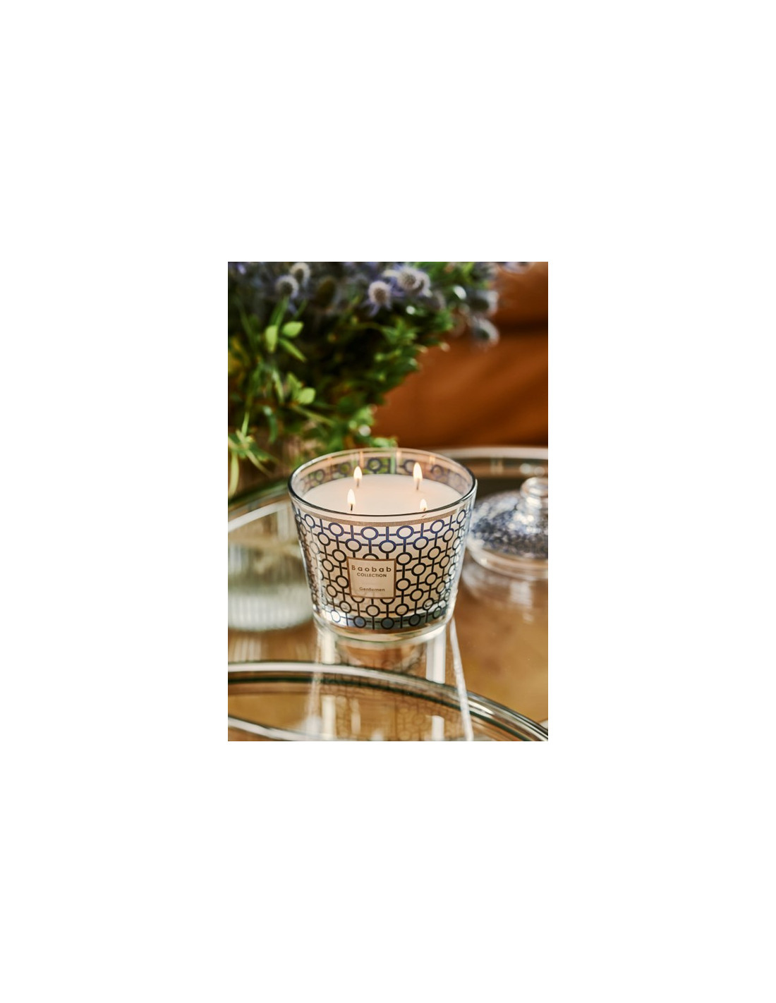 La cloche en verre soufflé, ornée d'une sérigraphie précieuse du design de la bougie de la cerise des gentlemen, enveloppe la bougie et en fait un coffret raffiné et délicat qui peut être utilisé dans une chambre pour ranger des bijoux ou dans un salon comme bonbonnière. Présentée dans une élégante boîte cadeau, la cloche peut être offerte avec la bougie assortie.