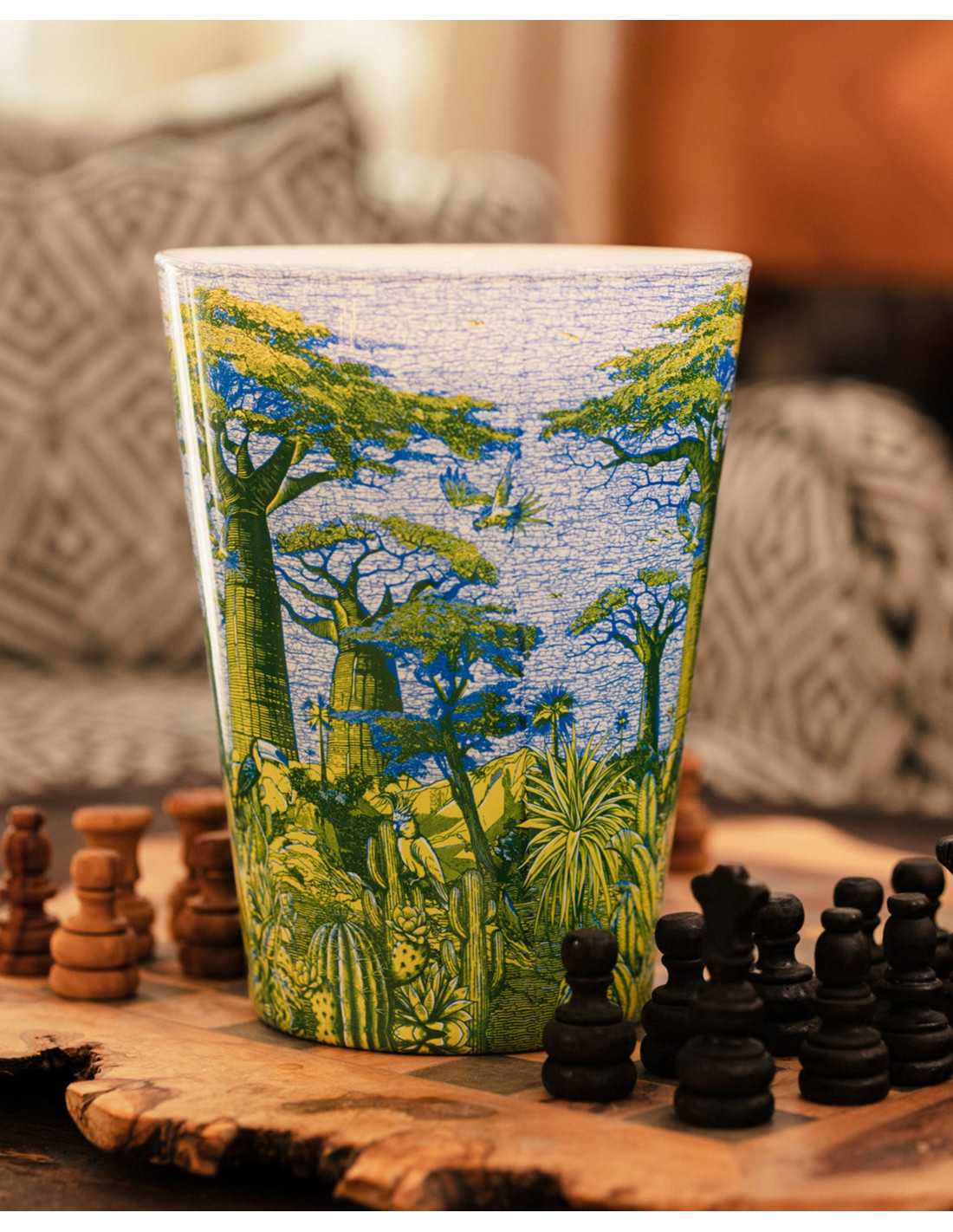La bougie parfumée Yarani est un hommage à la célèbre forêt classée d'Abidjan. Les tons verts et bleus représentent une forêt de baobabs conçue par des artistes talentueux de la fabrique de cire ivoirienne Uniwax.
