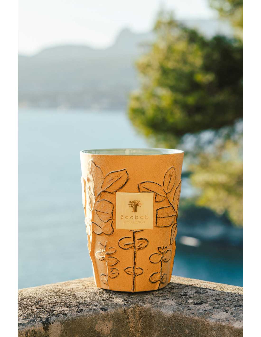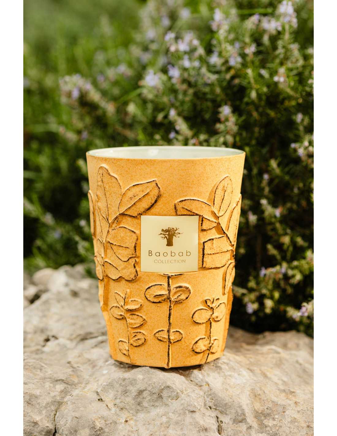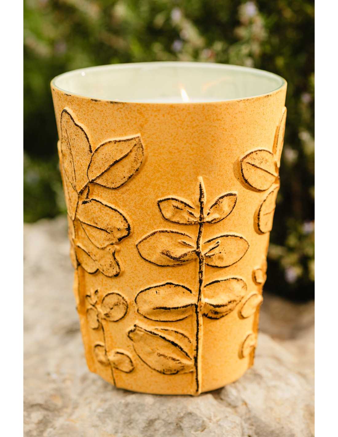 La bougie parfumée Garrigue est fabriquée en céramique artisanale avec un motif en relief de branches et de feuilles. La céramique est recouverte d'un émail jaune mat moucheté, qui contraste avec un émail vert céladon brillant à l'intérieur. Les couleurs de cette bougie sont à la fois subtiles et décoratives et peuvent être placées dans n'importe quelle pièce comme une sculpture naturelle.
