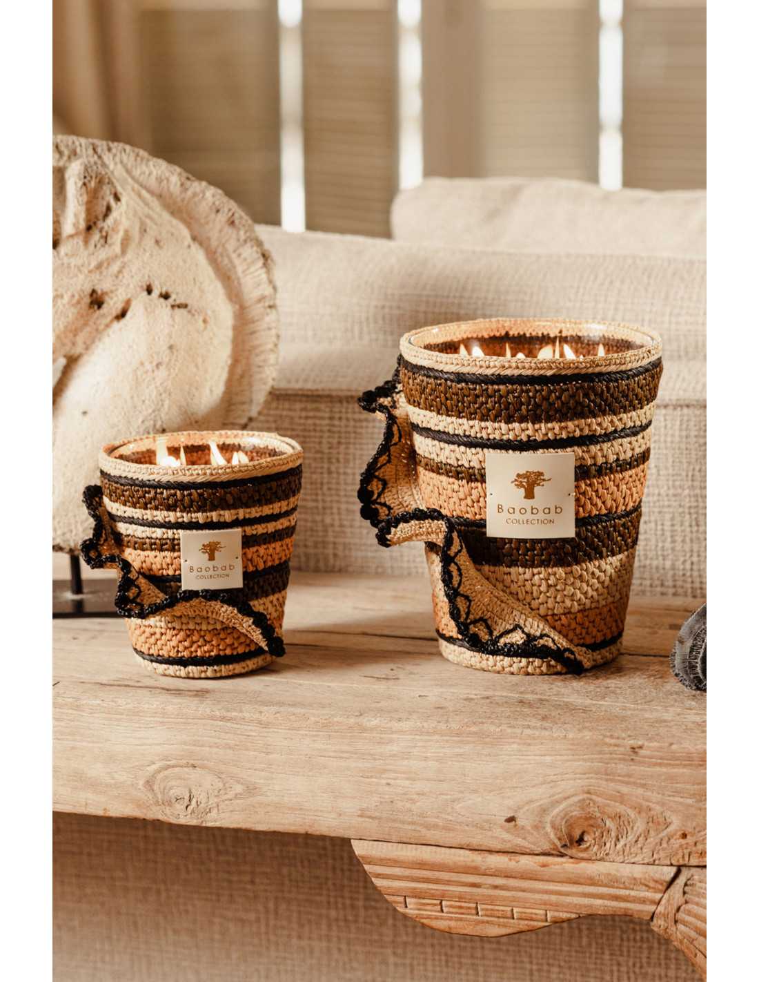 Les couleurs douces rose nude et kaki sont disposées en bandes de bayadère sur le raphia de la bougie parfumée Anjara. Tricotée à la main par les femmes de Madagascar, cette bougie devient un objet de décoration festif et délicat. Un volant latéral brodé en noir confère à l'objet parfumé l'aspect d'un accessoire de mode.