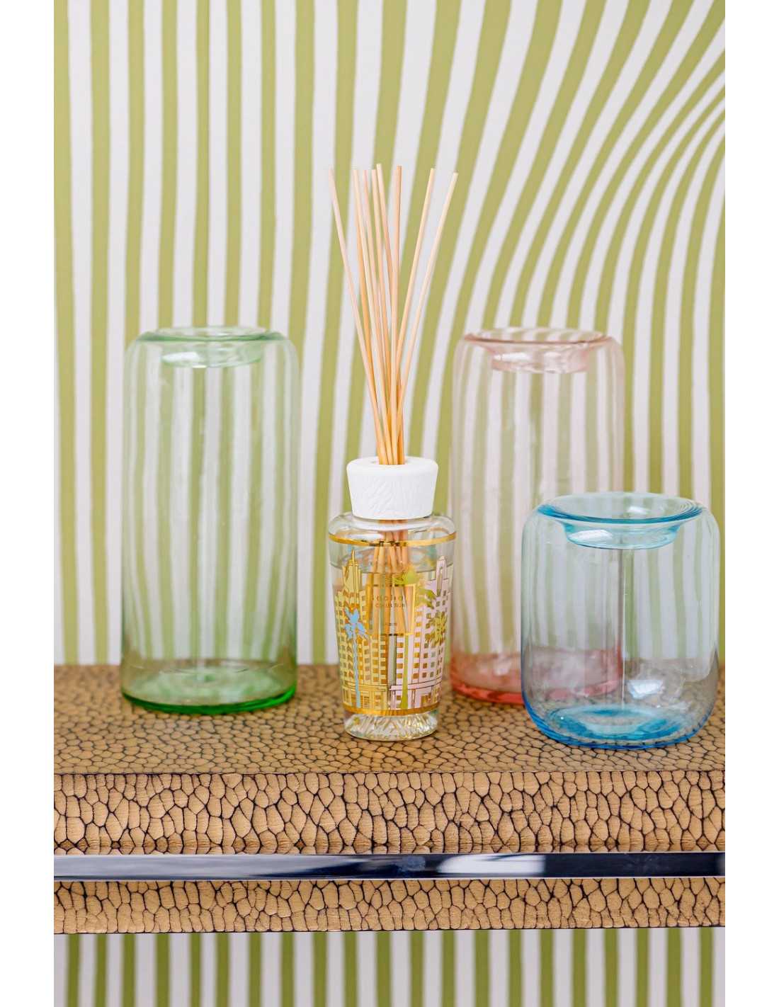 Le diffuseur de parfum d’intérieur Miami est décorée d’une sérigraphie aux tons pastels et or reprenant l’architecture des immeubles art déco de South Beach.