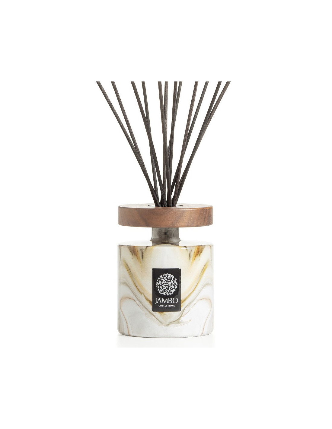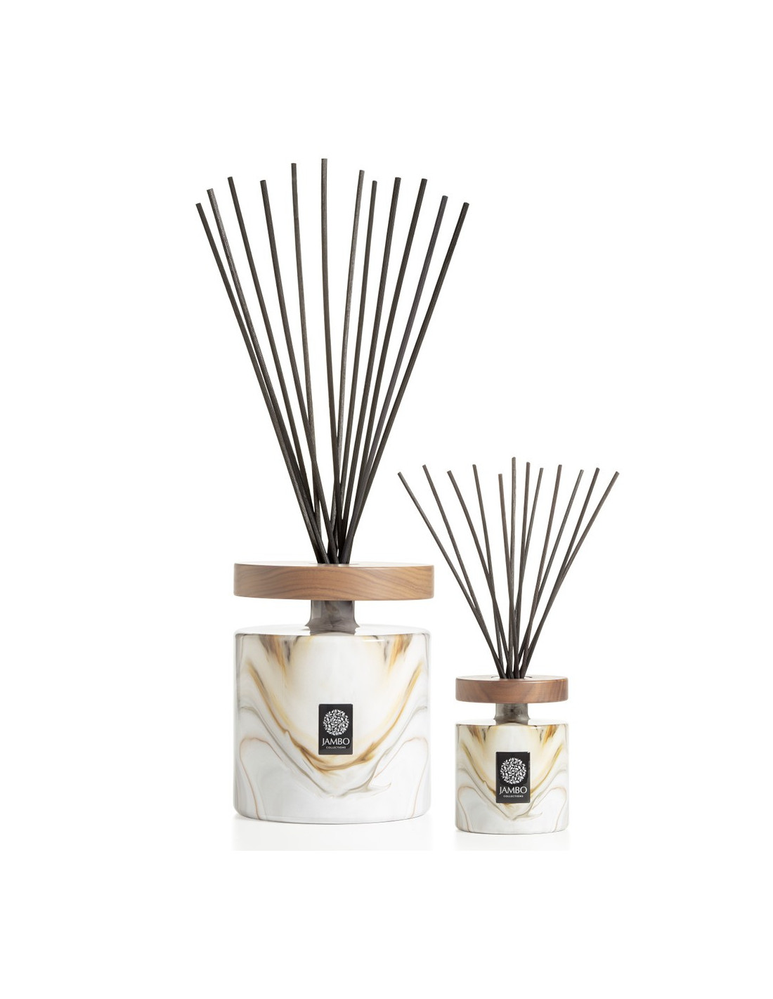 Les bouchons des diffuseurs sont fabriqués en bois massif, de sorte qu'aucun diffuseur ne ressemble à un autre. Jambo utilise du verre design italien pour les flacons et des bâtonnets de parfum en rotin de qualité supérieure provenant d'Indonésie. Des flacons de recharge sont disponibles et tous les emballages sont fabriqués à partir de matériaux recyclables. Jambo s'efforce d'utiliser le moins de plastique possible. Pour chaque bouteille vendue, un bel arbre robuste est planté dans la région du Sahel.