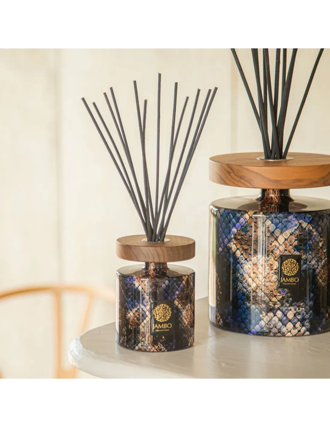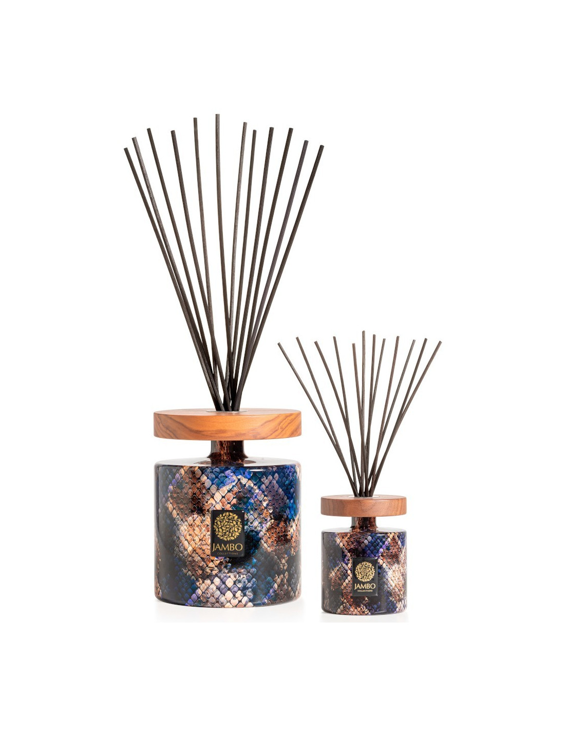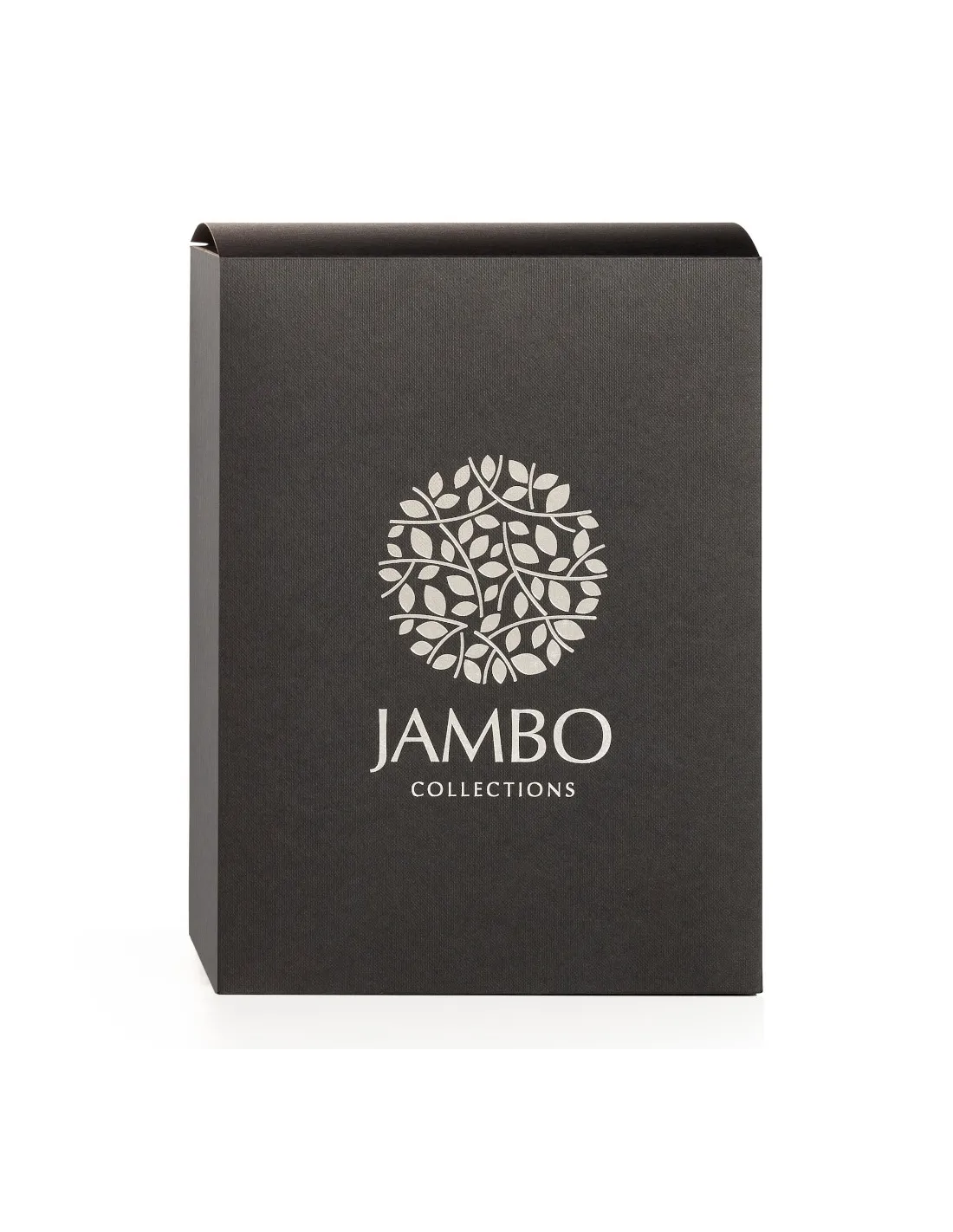 Les bouchons des diffuseurs sont fabriqués en bois massif, de sorte qu'aucun diffuseur ne ressemble à un autre. Jambo utilise du verre design italien pour les flacons et des bâtonnets de parfum en rotin de qualité supérieure provenant d'Indonésie. Des flacons de recharge sont disponibles et tous les emballages sont fabriqués à partir de matériaux recyclables. Jambo s'efforce d'utiliser le moins de plastique possible. Pour chaque bouteille vendue, un bel arbre robuste est planté dans la région du Sahel.