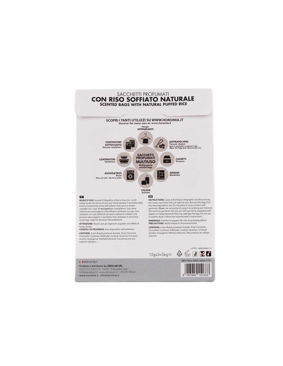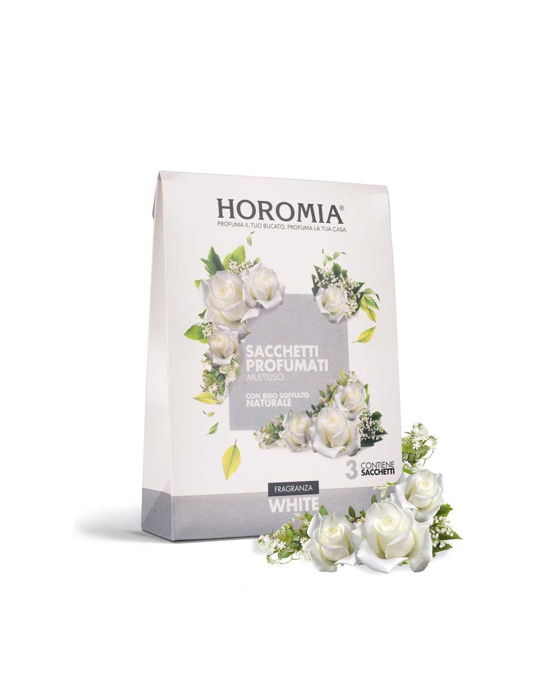 Le caractère unique et l'intensité des parfums Horomia se retrouvent désormais dans les sachets parfumés multi-usages. Créés à partir de riz soufflé naturel et non alimentaire, les sachets parfumés Horomia sont formulés pour donner à vos vêtements et à votre maison l'odeur unique et inimitable de votre parfum préféré. Chaque paquet contient trois sachets parfumés enveloppés dans un sachet transparent de haute protection pour un parfum intense et durable jusqu'à 12 semaines.