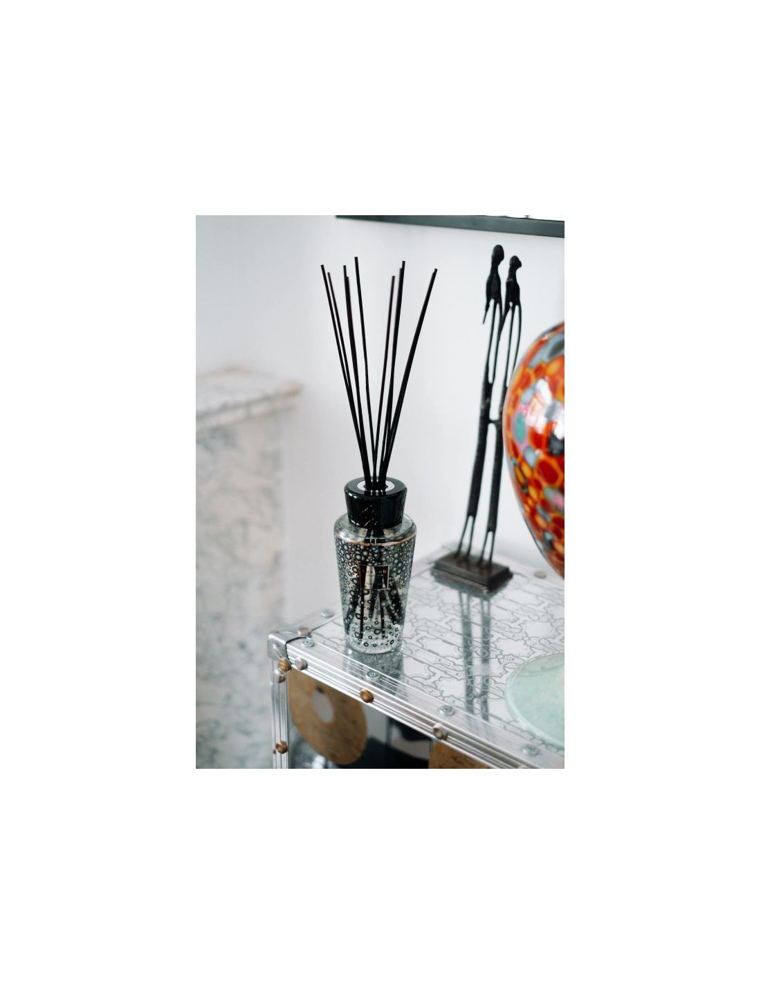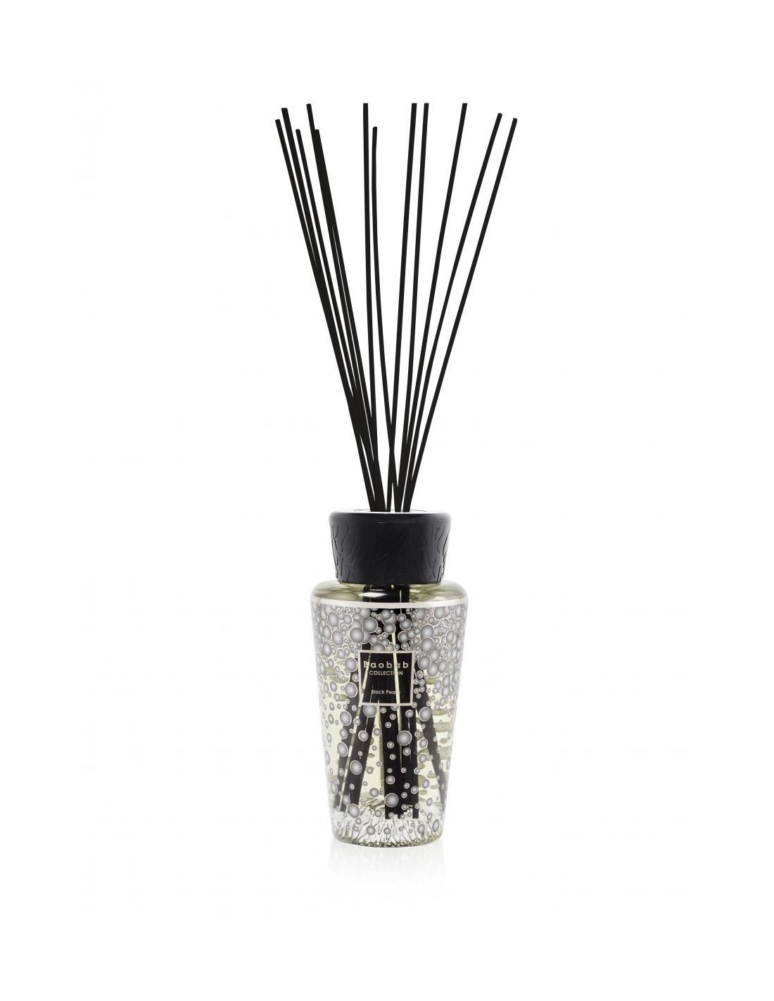 Le diffuseur de parfum d’intérieur Black Pearls est recouvert d’un motif sérigraphié de perles noires et de platine. On voit à travers le verre un dôme gravé de racines assorti au bouchon de bakélite noire.