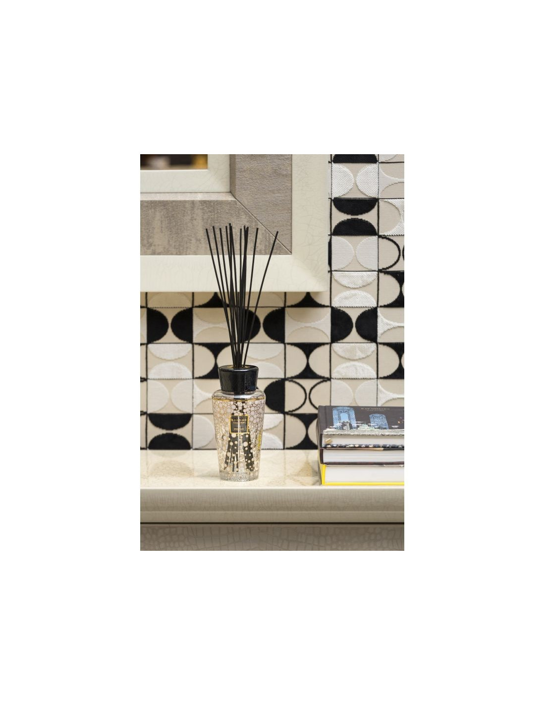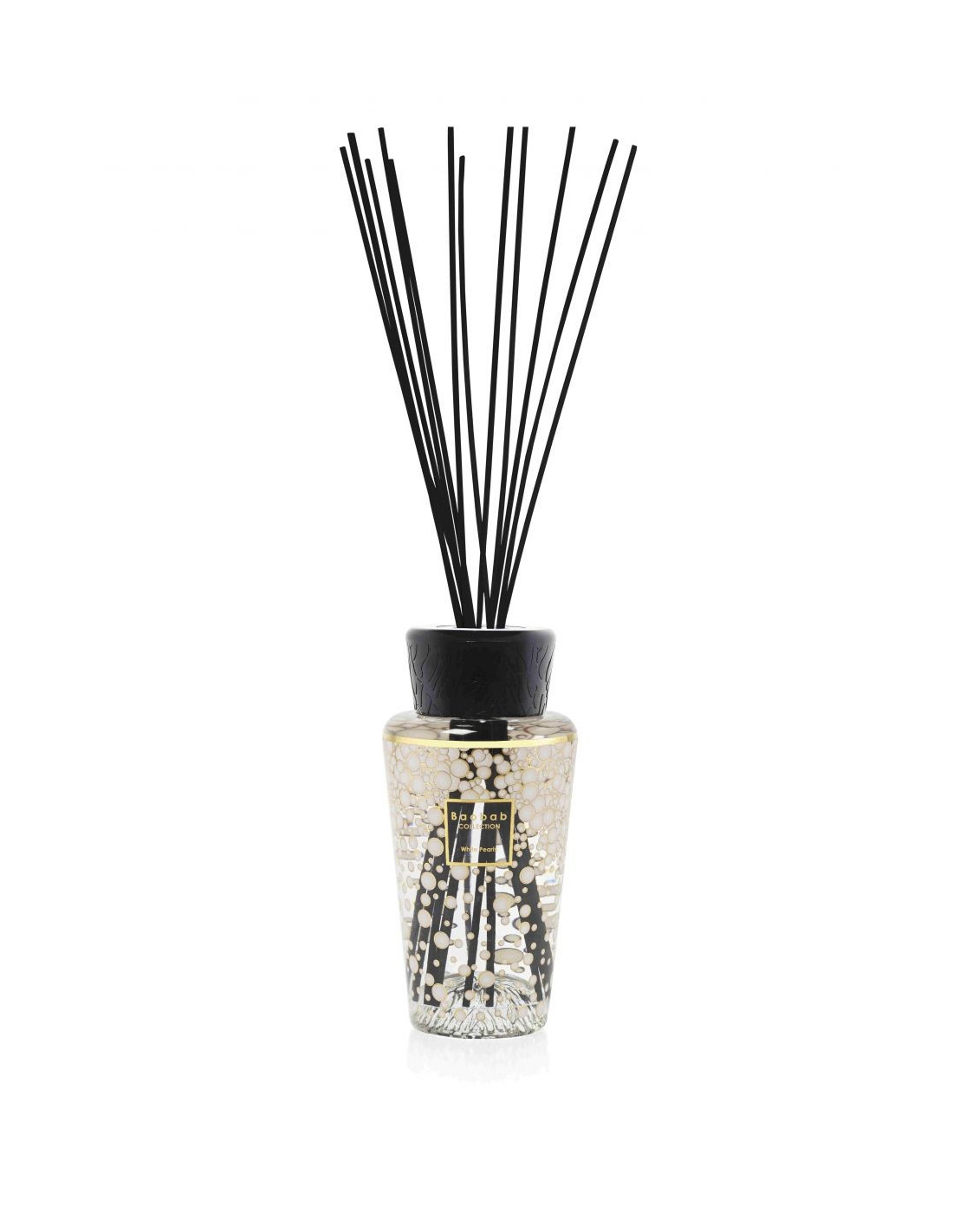 Le diffuseur de parfum d’intérieur White Pearls est un flacon recouvert d’une sérigraphie d’or 9 carats au motif de perles blanches. Un bouchon de bakélite noire gravé de racines termine l’objet avec élégance.