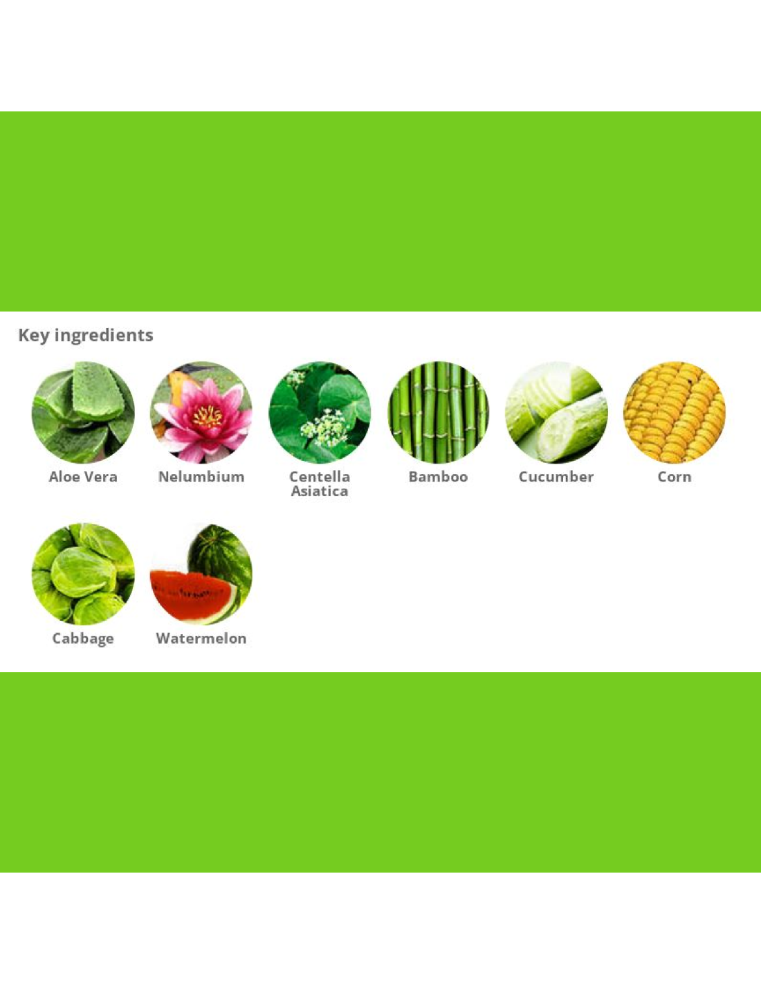 Ingrédients principaux: Aloe Vera, Nelumbium, Centella Asiatica, Bambou, Concombre, Maïs, Herbe, Pastèque.