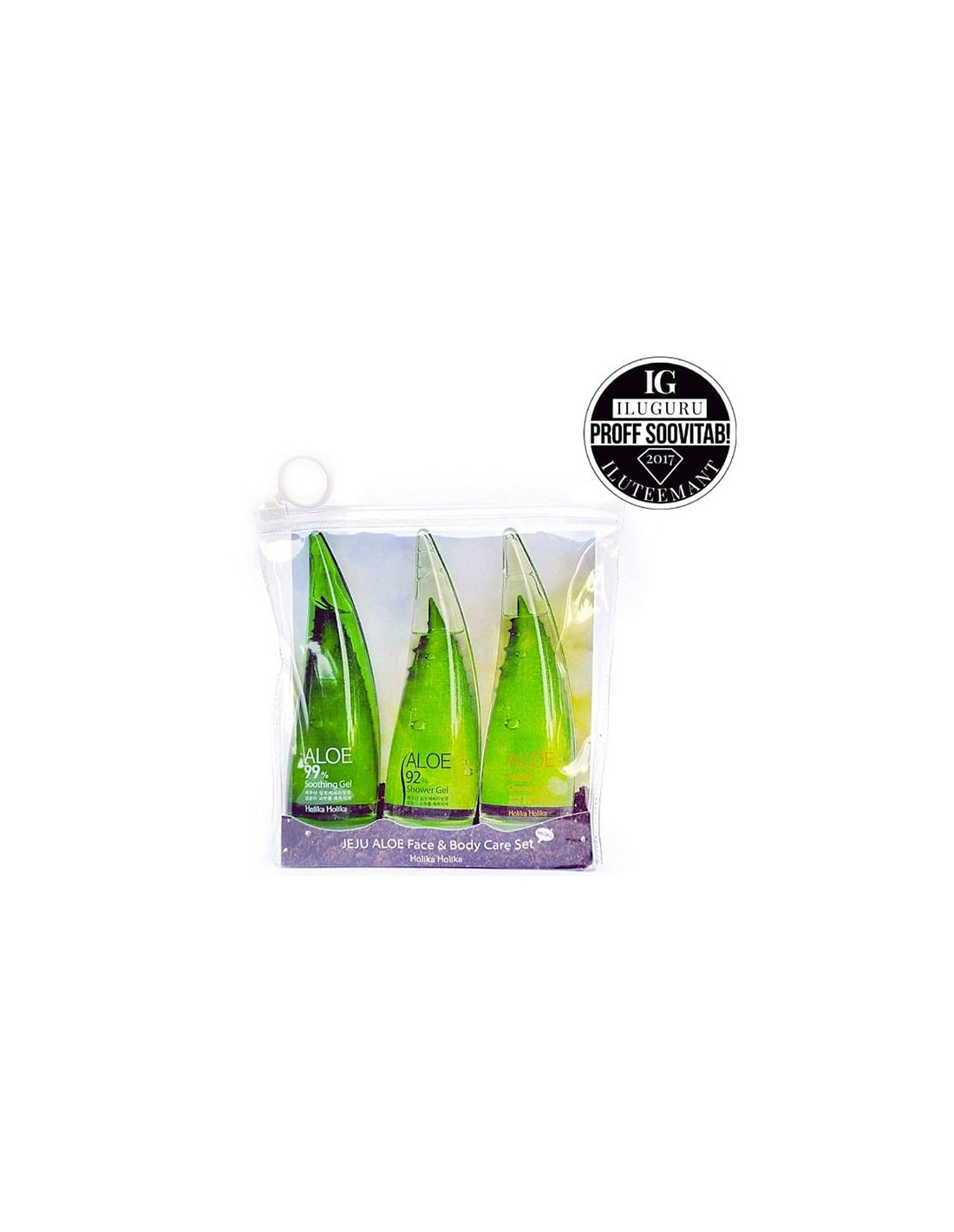 Le kit contient un gel douche (Aloe 92% Shower Gel), un gel apaisant pour le corps (Aloe 99% Soothing Gel) et une mousse nettoyante pour le visage (Aloe Facial Cleansing Foam).