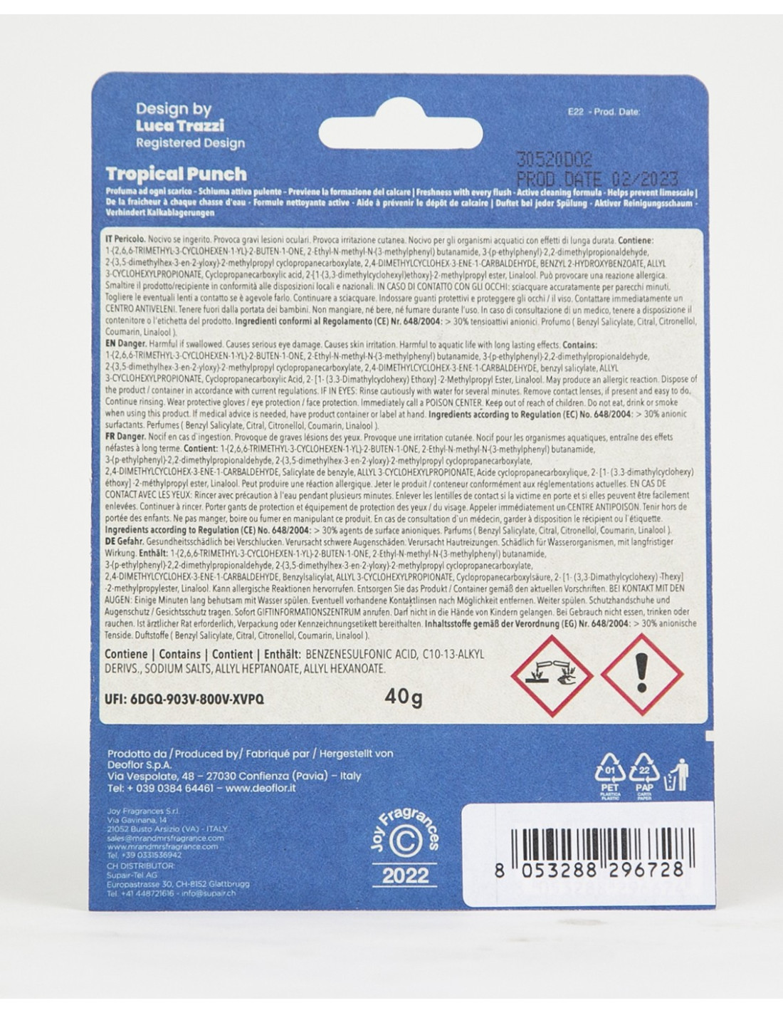 H302 Nocivo se ingerito. H318 Provoca gravi lesioni oculari.H315 Provoca irritazione cutanea. H412 Nocivo per gli organismi acquatici con effetti di lunga durata. EUH208 Contiene: 1-(2,6,6-TRIMETHYL-3-CYCLOHEXEN-1-YL)-2-BUTEN-1-ONE, 2-Ethyl-N-methyl-N-(3-methylphenyl) butanamide, 3-(p-ethylphenyl)-2,2-dimethylpropionaldehyde, 2-(3,5-dimethylhex-3-en-2-yloxy)-2-methylpropyl cyclopropanecarboxylate, 2,4-DIMETHYLCYCLOHEX-3-ENE-1-CARBALDEHYDE, BENZYL 2-HYDROXYBENZOATE, ALLYL 3-CYCLOHEXYLPROPIONATE, Cyclopropanecarboxylic acid, 2-[1-(3,3-dimethylcyclohexyl)ethoxy]-2- methylpropyl ester, Linalool Può provocare una reazione allergica.