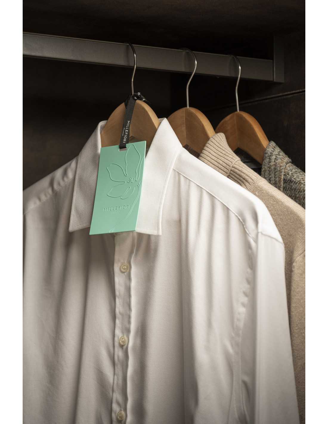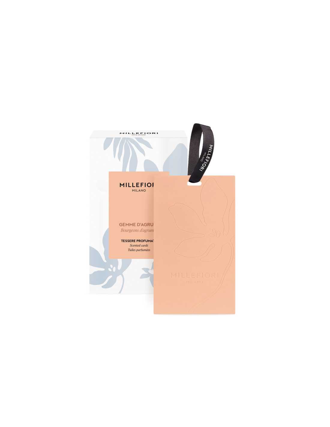 Colorate tessere profumate in confezione da tre, con logo Millefiori Milano e fiore decorativo inciso sul fronte e sul retro. Le tessere profumate possono essere riposte nei cassetti o appese nell'armadio grazie al pratico nastrino.