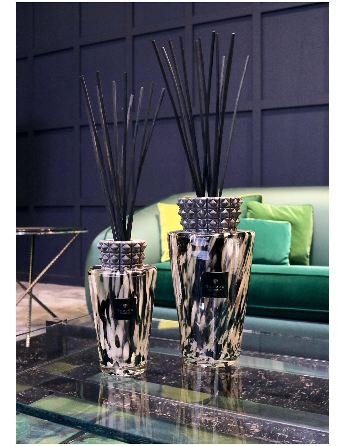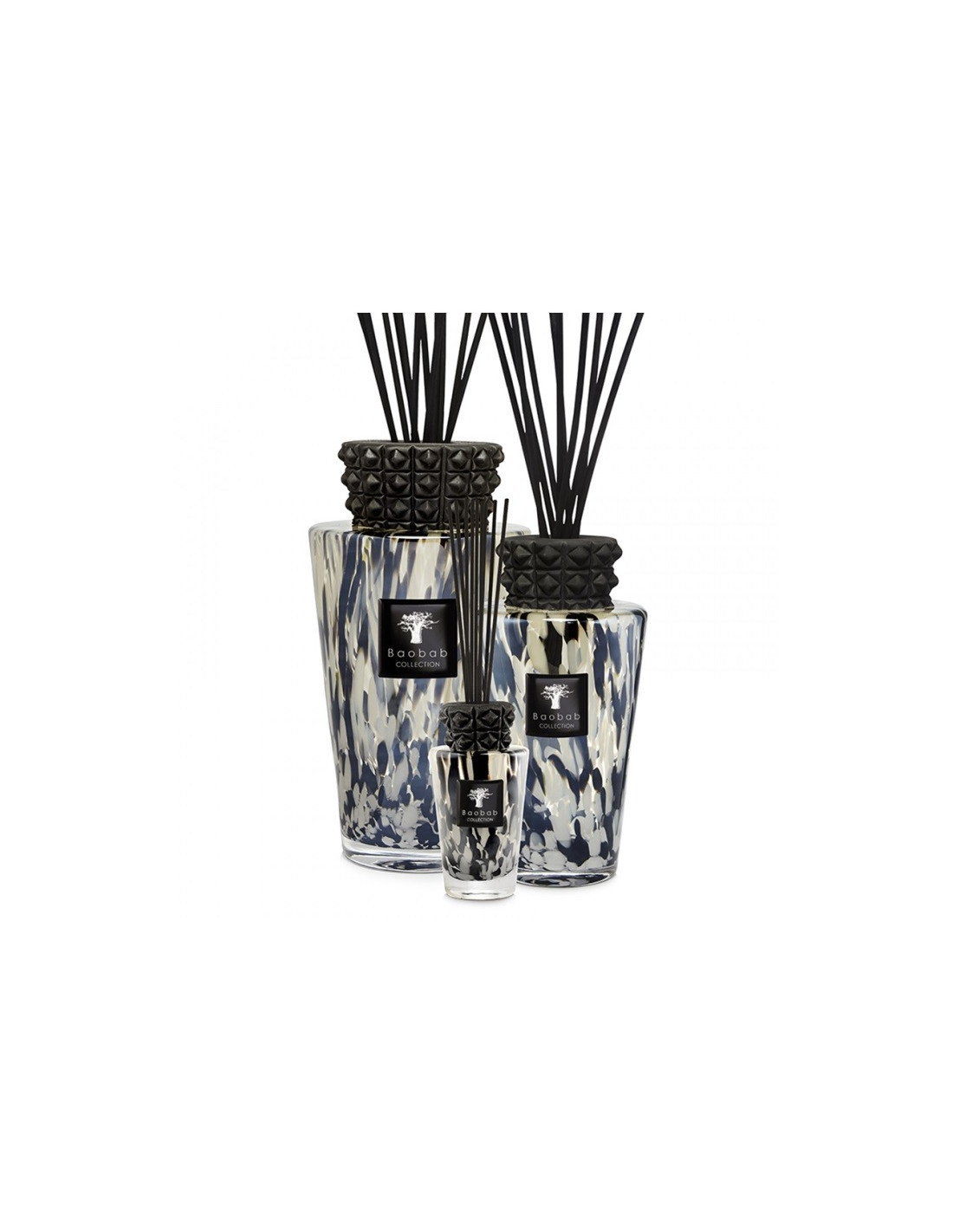 Il vetro soffiato a mano dagli artigiani vetrai è cosparso di coriandoli neri e iridati che evocano le perle nere del Pacifico. La chiusura decorativa scultorea in ceramica smaltata forma un rilievo grafico inatteso, che dona a questo flacone un carattere decorativo intenso e tribale.