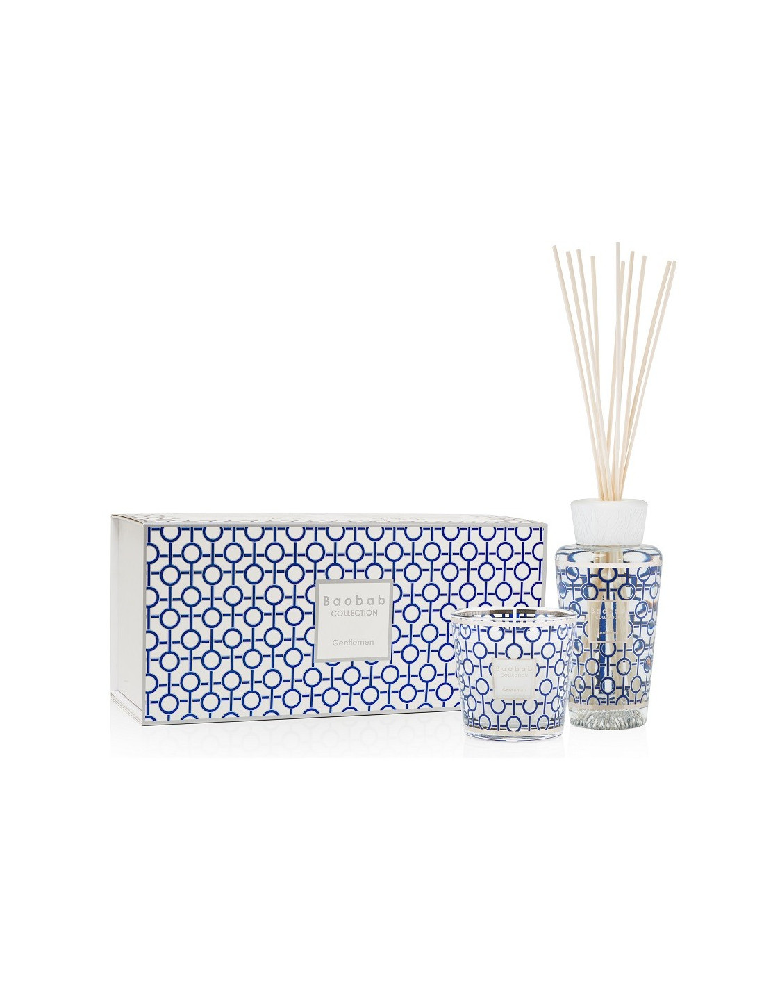 Le candele profumate e diffusori di fragranze Gentlemen sono realizzati in un vetro ricoperto da una serigrafia color platino e blu marino. Il profumo di rum, zafferano e labdano è una fragranza maschile totalmente irresistibile.